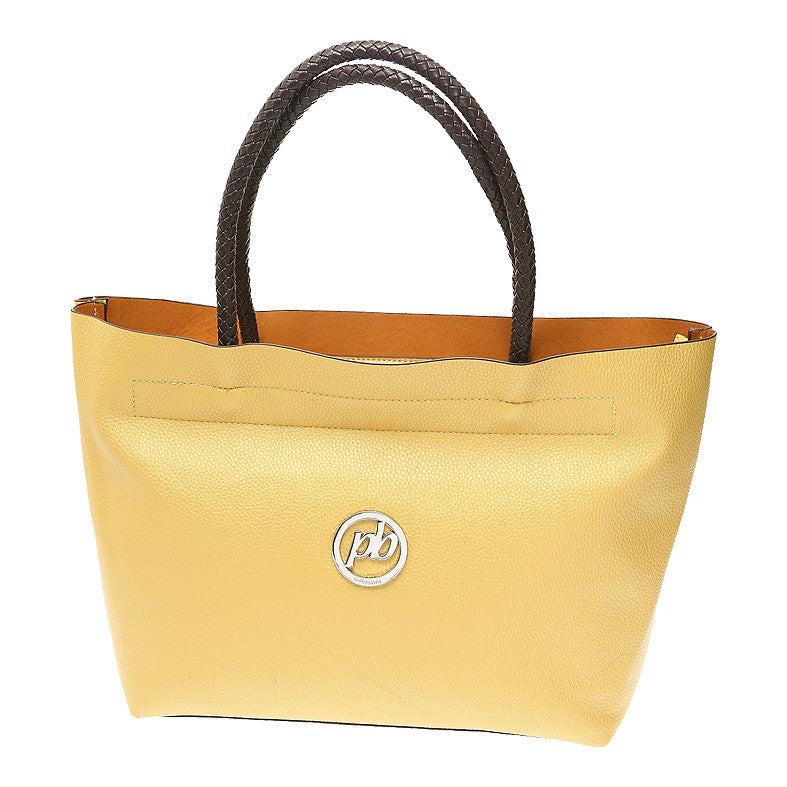 Este bolso de dama combina en perfecta armonía, su color dorado en una cuerina corrugada y asas marrones trenzadas la hacen cómoda y estable. Tiene 1 bolsillo interno para facilitar su orden y cierre superior. Su logo metalizado es chic y elegante.